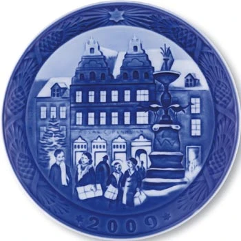 The 2009 Christmas plate, “Christmas at Amagertorv”, shows one of the best preserved and oldest houses in inner Copenhagen. On this year’s plate, in front of the beautiful snow-clad building one sees busy Christmas shoppers, with large packages in hand, trying to wind up their Christmas shopping. Also visible is the decorative Stork fountain, which has been part of the beautiful setting at Amagertorv since 1894 and has made the square a favourite spot for Copenhageners and tourists alike.