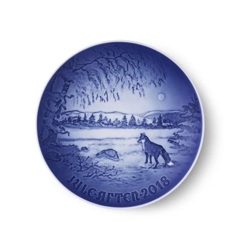 2018 Bing and Grondahl Christmas Plate. A lone wolf taking in the wintry countryside under a full moon. The motif on the plate is number 124 in the series and designed by Dag Samsund.