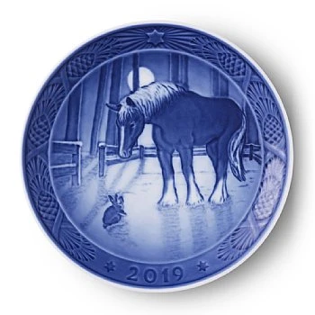 The Christmas plates from Royal Copenhagen have been issued every year since 1908. The relief for the motif has been hand-cut by the most talented modeling artists based on the designer’s drawing, and the plate has been cut according to old, proud craftsmanship traditions. This plate was designed and sculptured by Allan Therkelsen who has also designed this year’s bell, drop and cup. “How sweet you are,” thinks the horse. It shakes itself in its winter coat and looks curiously at its new, soft friend. Although animal life is rich in the country side, it is obvious that the two are meeting for the first time.