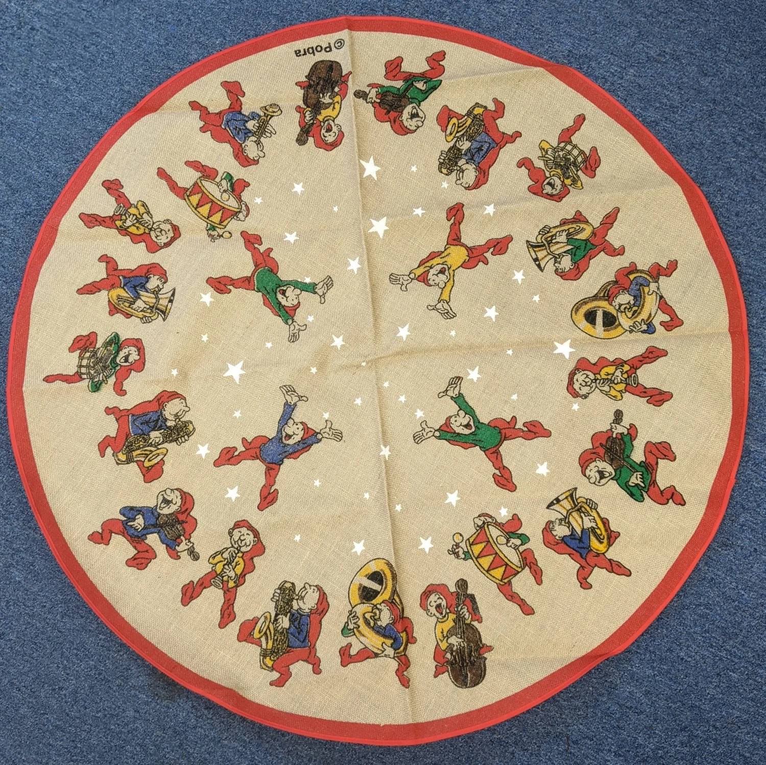 Bramming elves decorate this Christmas tree carpet. It is 47-1/2″ in diameter natural burlap-looking background.