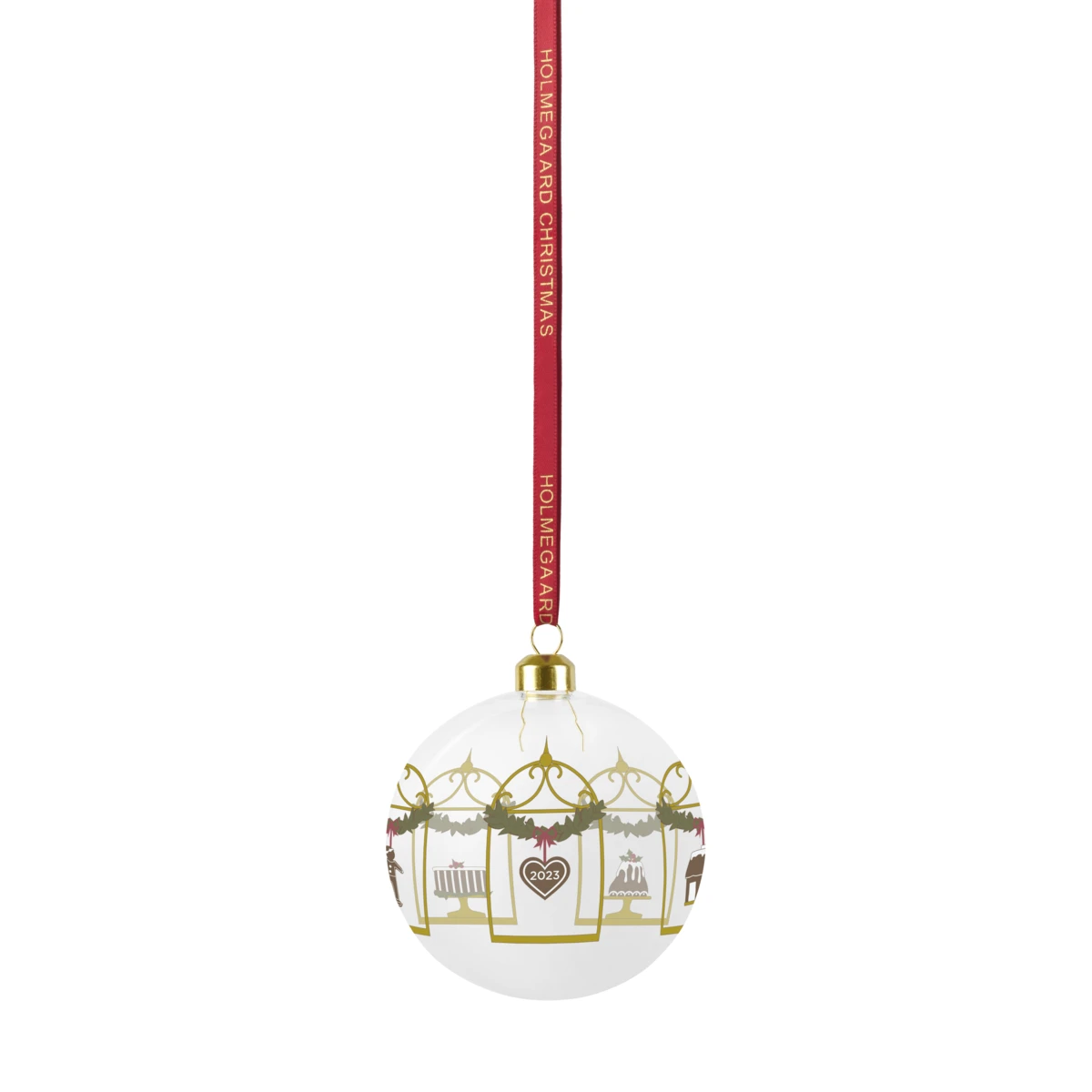 With artist Jette Frölich’s nostalgic and masterful paper cuttings, Holmegaard Christmas invites you to take a look through the windows of a traditional old bakery. Admire Jette Frölich’s nostalgic and artistic universe up close on the stylish 3.1″ diameter Christmas bauble, and decorate your tree or a spruce branch with the beautiful, mouth-blown bauble. The motif on the Holmegaard Christmas Annual Christmas Bauble 2023 is based on Jette Frölich’s Christmas scene of a classic bakery shop, and shows five windows decorated with Christmas spruce and red bows. In each window you will find a cake – iced Christmas cakes and holly on a centerpiece, a gingerbread man, a gingerbread house and a gingerbread heart with the year in it. The motif on the Christmas bauble is a variation of the motifs that adorn the entire Holmegaard Christmas 2023 series. The motifs are based on reflections on the magic of Christmas, and beautifully convey children’s love of Christmas and the sense of anticipation for the big day. The bauble comes with a fine red silk ribbon.