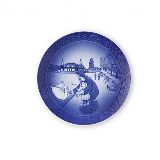 ROYAL COPENHAGEN Christmas Plate 2017. The beautiful swans should also be taken care of on Christmas Eve, thinks the little girl to herself, as she and her father feed Denmark’s national birds by the old Peblinge Lake. The lake once served as part of Copenhagen’s defence and water supply. Nowadays it is just a beautiful setting and when it freezes over it is perfect for ice-skating. The Lake Pavilion sits in the background built for the capital’s Skating Association in 1894. The motif of this year’s Royal Copenhagen Plate also appears on the cup, the bell and the drop. Allan Therkelsen who designed the plate has also sculpted the accompanying figure who of course is the little girl from the motive.